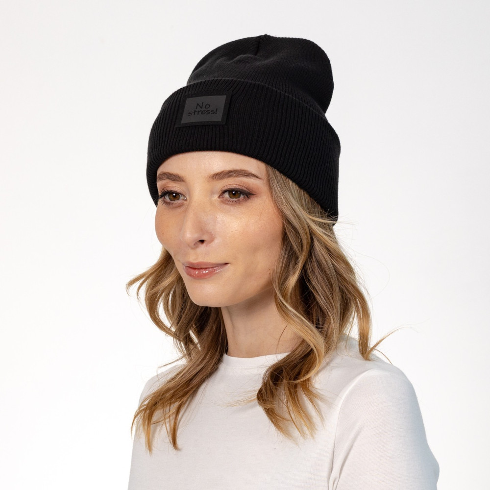 Шапка-біні ДОННА — жіноча модель з відворотом у стилі кежуал. Виконана гладкою в’язкою з резинкою, доповнена срібною нашивкою "No stress!", що додає сучасного акценту. Склад: 50% бавовна, 50% акрил. Легка та м’яка шапка-біні ідеально підходить для сезону осінь-весна, поєднуючи комфорт, практичність і стиль.